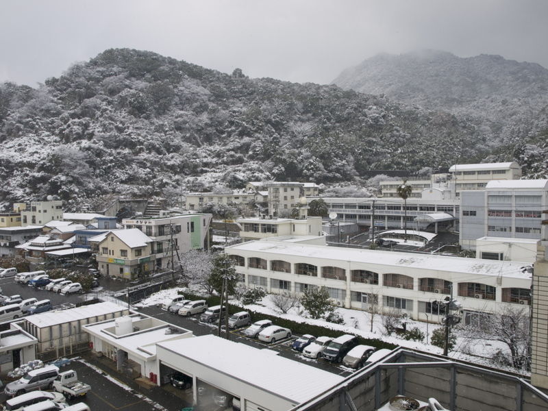 病院の6階から看護学校、後ろに龍ヶ岳地域振興センターそして龍ヶ岳山頂がうっすらと見えます。