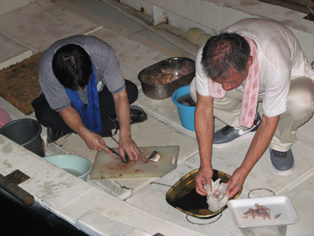 バーベキューの途中で、前事務長が合流、前事務長の釣ってきたばかりのあじを料理長がさばいているところです。右の写真は、今日からこられた研修医の西村先生です。タイミングのいい時でした。ラッキーです。