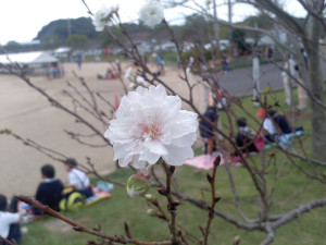 当院のDMATチームが搬送された模擬患者さんのトリアージ参加したこどもたちのそばで、グランドのさくらの花が開いていました。