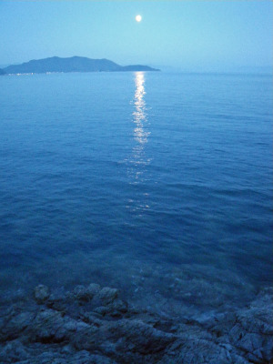 日が長いですね。午後8時、樋島(ひのしま)上に出た月です(T.T.)
