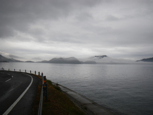 今朝の風景です。松ヶ鼻から桐島とその隣の樋島を見たところです。海から島にかけて朝もやが垂れ込めていました。写真を撮っていて遅刻しそうになりました(T.T.)。